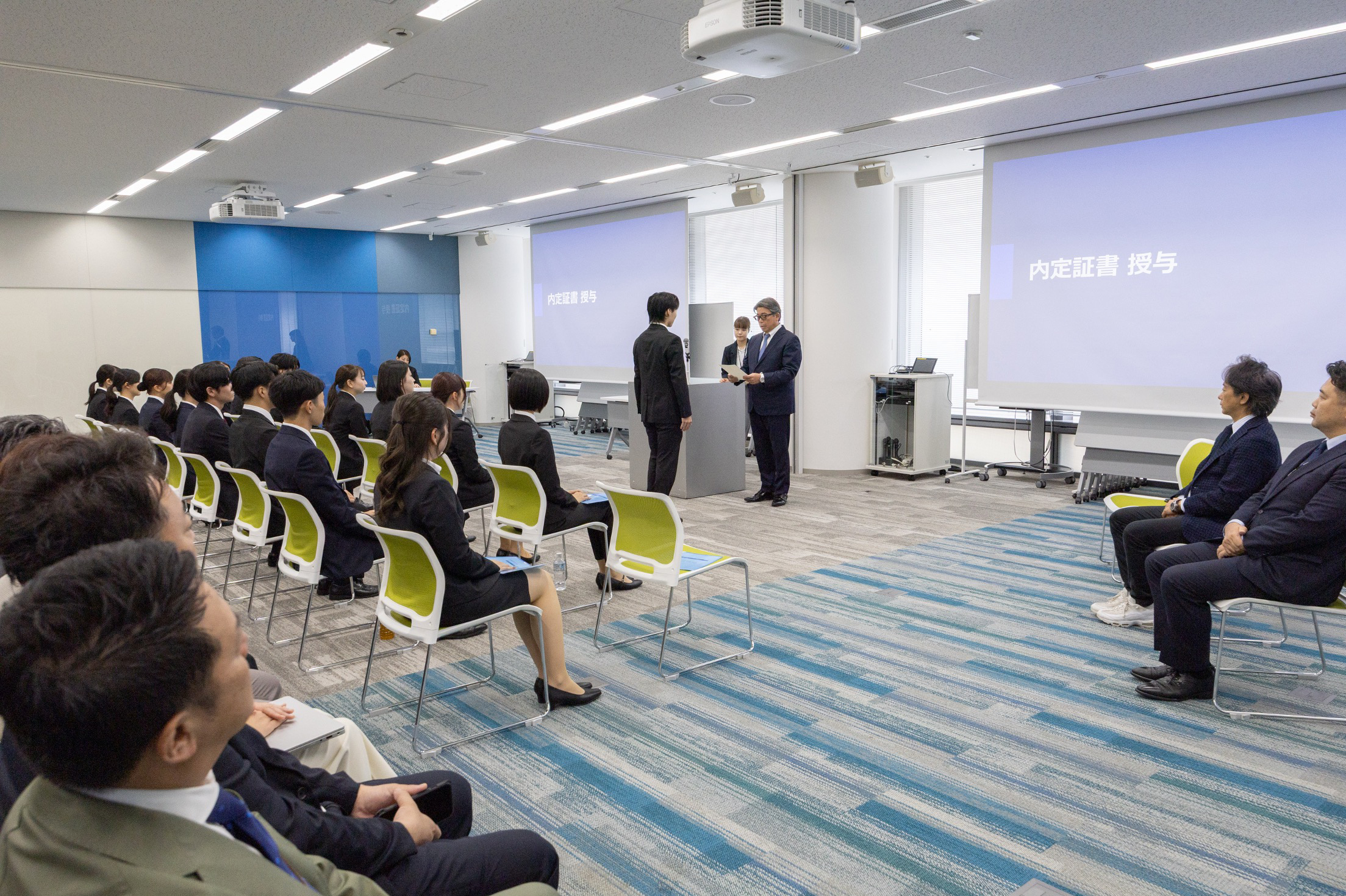 内定証書授与から始まった内定式。代表取締役社長執行役員 鈴木篤が「おめでとうございます」と声をかけながら、内定者一人ひとりに内定証書を手渡しました。名前を呼ばれ、前に進む内定者の表情からは、緊張とともに社会人としての一歩を踏み出す覚悟と期待が感じられました。
