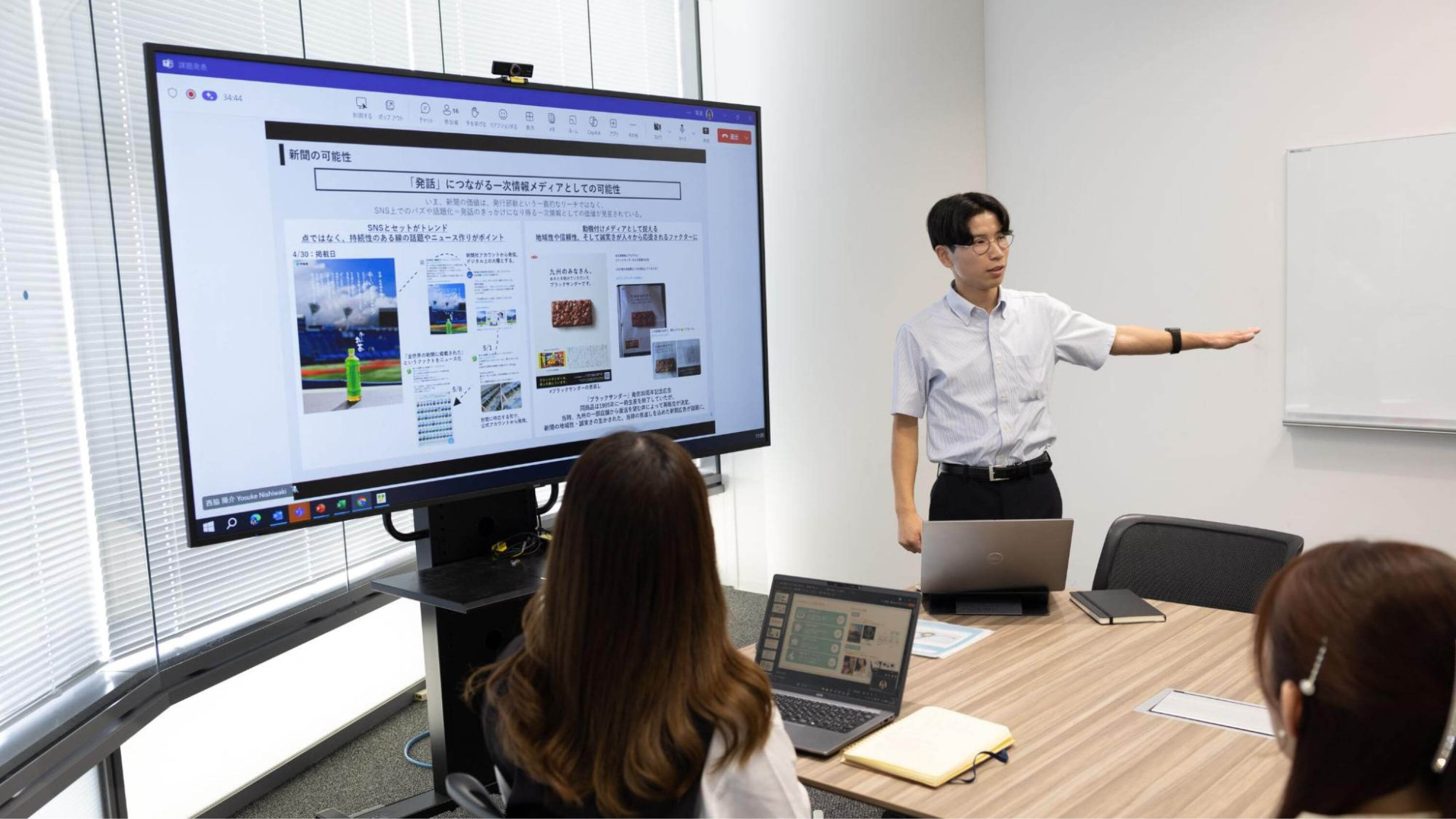 新卒社員は、プレゼンの相手をクライアントだと想定して発表を行います。「テレビが持つ3UP効果」「タイムCMとスポットCMの違い」「OOHの認知拡大性と拡散力」「デジタルメディアの即時性・ターゲティング精度の高さ」といった各種広告媒体の強みから、「SNSとセットにすることで広がる新聞の可能性」「高精度なターゲティング力を持つ雑誌の魅力」「Z世代における過去10年間のラジオ利用率の変化」といった長年親しまれてきた媒体の効果的な活用方法まで、発表者ごとに内容はさまざまです。